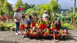 Lebih lanjut dikatakan :”dengan kegiatan yang dikemas dengan riang gembira anak anak akan merasakan suasana lain diluar sekolah, suana kebun disini sangat mendukung untuk anak anak bermain sambil merasakan sesasi dengan buah buahan yang beraneka ragam ada durian, alpokat lengkeng jeruk serta buah buah lainnya”.